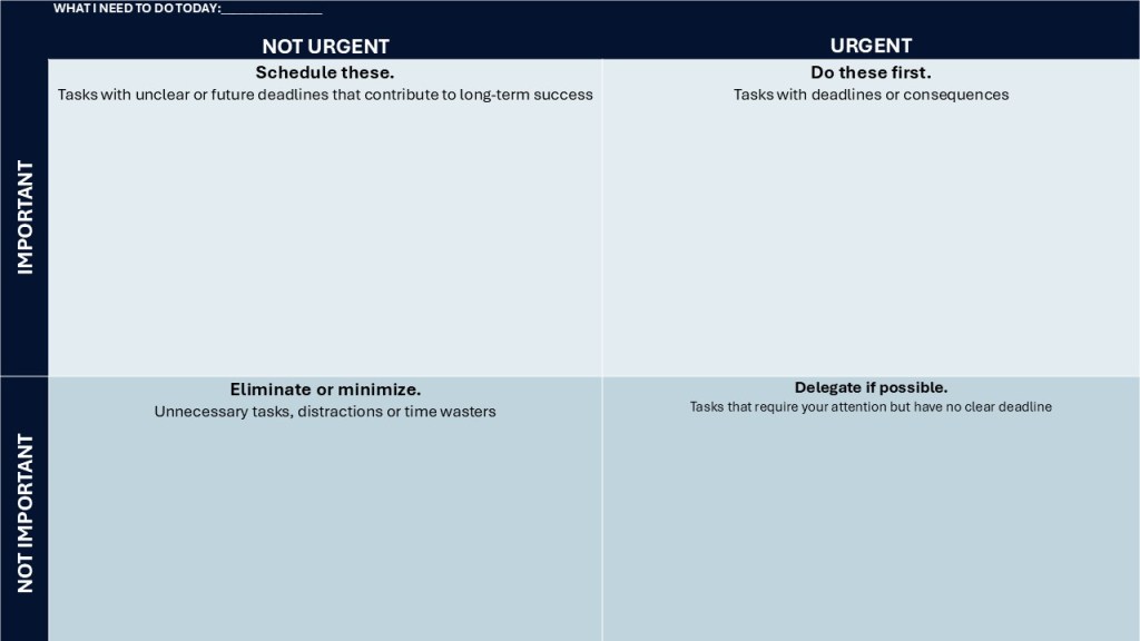 • Pros: Simple and intuitive; helps distinguish between urgent and important tasks.